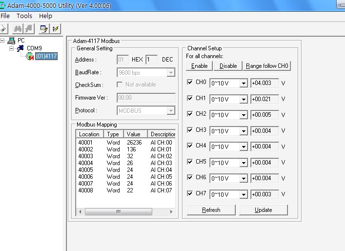 如圖所示,電腦的COM9連接的是ADAM-4117模塊,研華的軟件可以讀出40001地址的數據,為什么電腦的modbus軟件讀不出呢?怎么回事,哪里的問題?