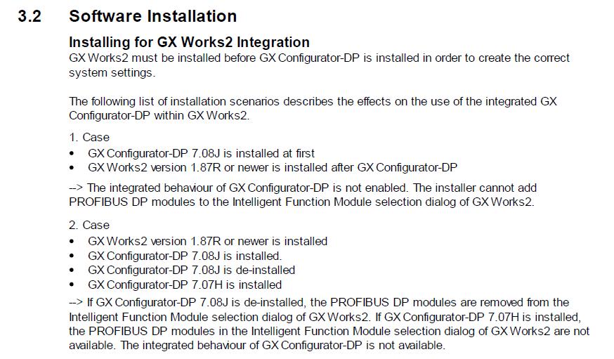 Software InstallationInstalling for GX Works2 IntegrationGXWorks2 must be installed before GXConfigurator-DP is installed in order to create the correctsystem settings.The following list of installation scenarios describes the effects on the use of the integrated GXConfigurator-DP within GXWorks2.1. CaseGXConfigurator-DP 7.08J is installed at firstGXWorks2 version 1.87R or newer is installed after GXConfigurator-DP--> The integrated behaviour of GXConfigurator-DP is not enabled. The installer cannot addPROFIBUS DP modules to the Intelligent Function Module selection dialog of GXWorks2.2. CaseGXWorks2 version 1.87R or newer is installedGXConfigurator-DP 7.08J is installed.GXConfigurator-DP 7.08J is de-installedGXConfigurator-DP 7.07H is installed--> If GXConfigurator-DP 7.08J is de-installed, the PROFIBUS DP modules are removed from theIntelligent Function Module selection dialog of GXWorks2. If GXConfigurator-DP 7.07H is installed,the PROFIBUS DP modules in the Intelligent Function Module selection dialog of GXWorks2 are notavailable. The integrated behaviour of GXConfigurator-DP is not available.