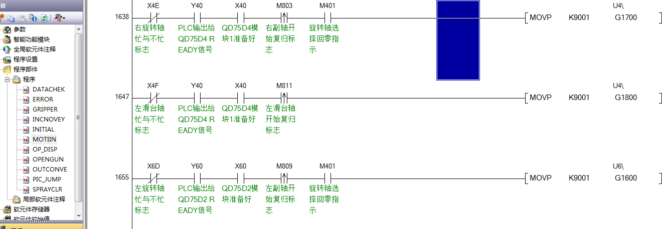 是啊,2樓說的沒錯(cuò),這是QD75定位模塊的緩沖存儲(chǔ)器地址,把K9001傳給它意思是讓相對(duì)應(yīng)的軸做原點(diǎn)回歸動(dòng)作。
