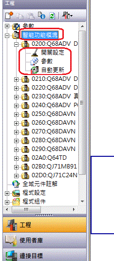 "智能功能模塊" 按右鍵 "新增模塊"----> 類比模塊  Q64AD模塊  設定安裝位置參數