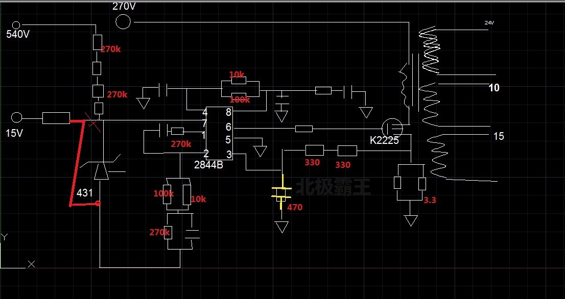 根據實物苗了個大概,實在看不清,方塊不管電容還是電阻,問題是此電源沒有取樣光耦,431的G腳是空腳,實在搞不懂是如何穩壓的?開機28V,接上風機后23.5V,變壓器沒有反饋繞組,哪位師傅有類似的電路,給個產考?謝謝大家了