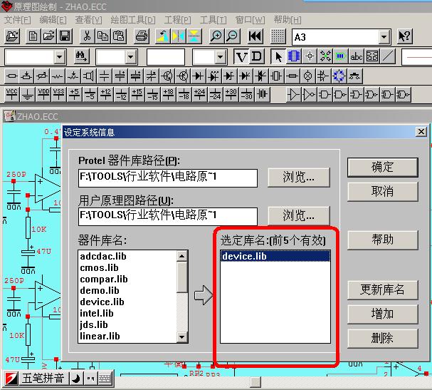1, 啟動(dòng) Windows, 直接運(yùn)行文件夾中的 ECC.EXE, 如果出現(xiàn)提示, 說沒找著 CTL3DV2.DLL, 或者說 CTL3DV2.DLL 未正確安裝, 則將文件夾器中的 CTL3DV2.DLL 拷貝至 Windows 下 的 System32 子目錄,如 C:\WINDOWS\SYSTEM32。重試,又如出現(xiàn)提示未找到XXX器件庫(kù),打開菜單項(xiàng)“工具”“設(shè)定系統(tǒng)信息”,選定增加lib格式的相應(yīng)的器件庫(kù)即可(如圖)。
