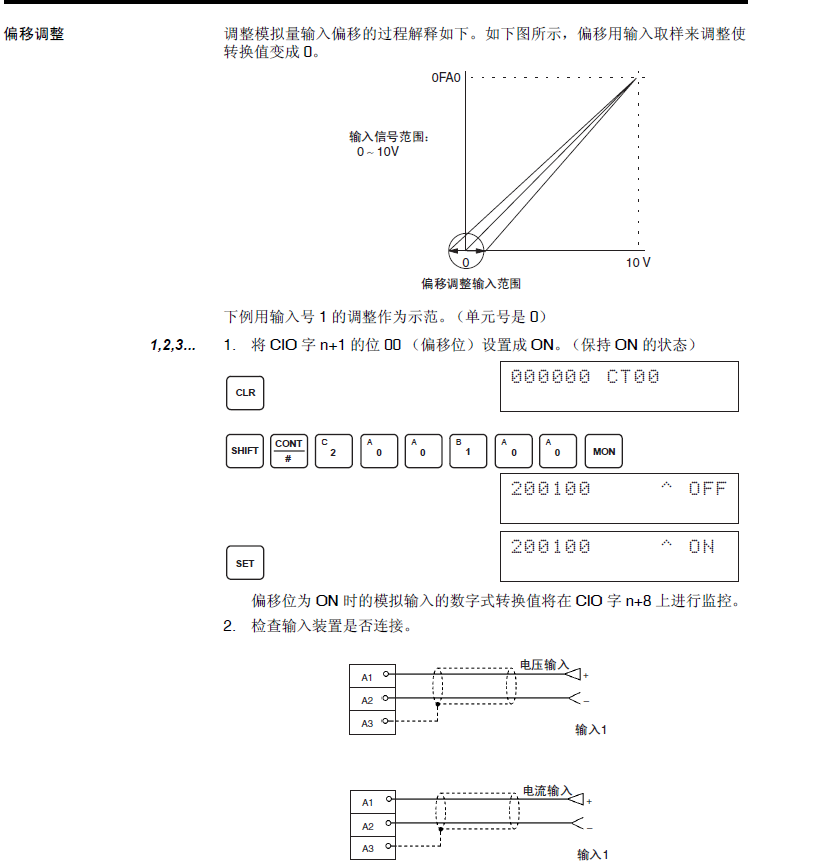 6. 在輸入電壓或電流使得模擬量輸入端子的轉換值為0000 后,將CIO 字n+1