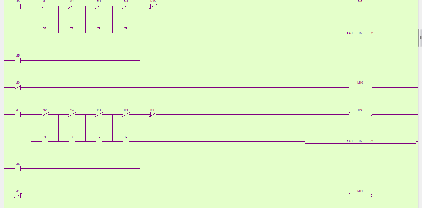 每次發出下料請求時,按流水式切換M25---M21(導通一位就上一位復位,只導一個觸點)M25導通時只輸入D0的值,M24導通時只輸入D1的值。。。。。。。。。
