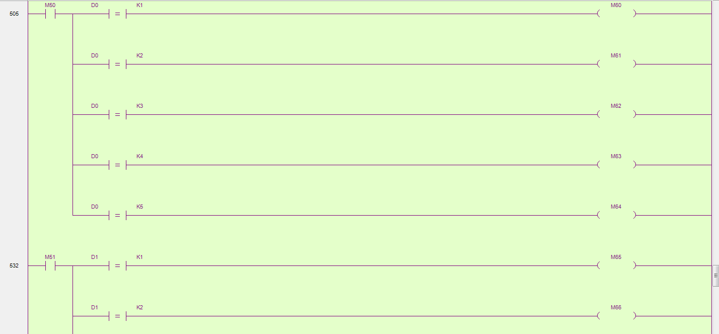 再用流水式比較D0----D4的值屬于哪個倉室,就輸出對應等值一行的繼電器,直到這倉補完料,在切到下一個D值進行比較輸出。