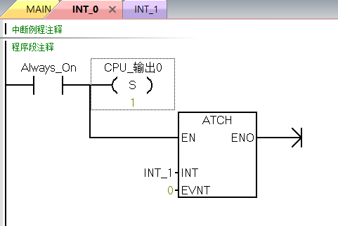 在主程序中開啟中斷,當I0.0的上升沿信號到來時進入INT0中斷程序,置位Q0.0。
