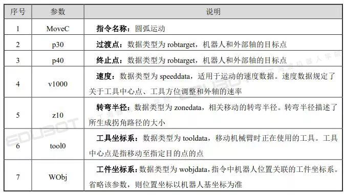 MoveC說明:機(jī)器人通過中間點(diǎn)以圓弧移動(dòng)方式運(yùn)動(dòng)至目標(biāo)點(diǎn),當(dāng)前點(diǎn)、中間點(diǎn)與目標(biāo)點(diǎn)3點(diǎn)決定一段圓弧,機(jī)器人運(yùn)動(dòng)狀態(tài)可控制,運(yùn)動(dòng)路徑保持唯一。MoveC指令常用于機(jī)器人在工作狀態(tài)移動(dòng)