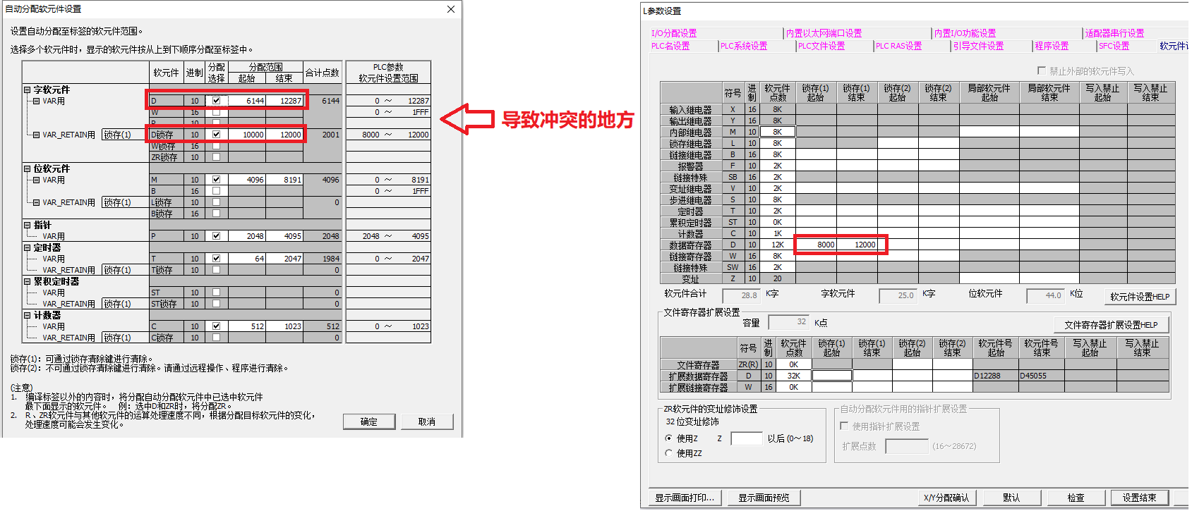 引用引用第3樓楓落云端于2021-12-02 09:53發(fā)表的 :自動(dòng)分配軟元件中 不帶鎖存的局部標(biāo)簽?zāi)J(rèn)是分配D6144-D12287你在參數(shù)中設(shè)定了D8000-D12000為鎖存軟元件了,導(dǎo)致沖突,所以會(huì)報(bào)錯(cuò)。