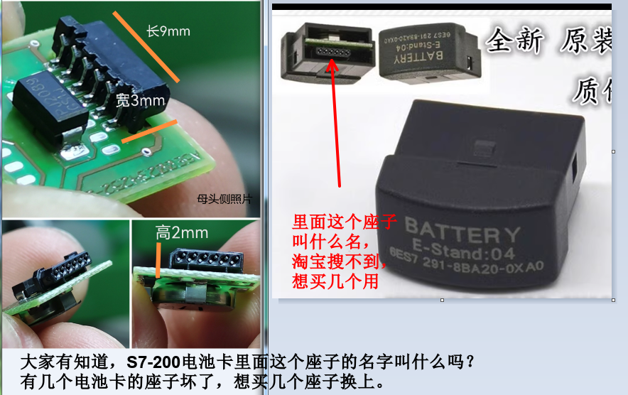 因?yàn)槭掷锸畮讉(gè)S7-200電池卡,座子都?jí)牧耍拥袅丝上В胭I(mǎi)座子回來(lái)修起它們來(lái),但是問(wèn)了很多商家也沒(méi)有賣(mài)的,大家有知道,這個(gè)東西哪里有賣(mài)的嗎,或是關(guān)鍵詞叫什么?我查下,謝謝大家
