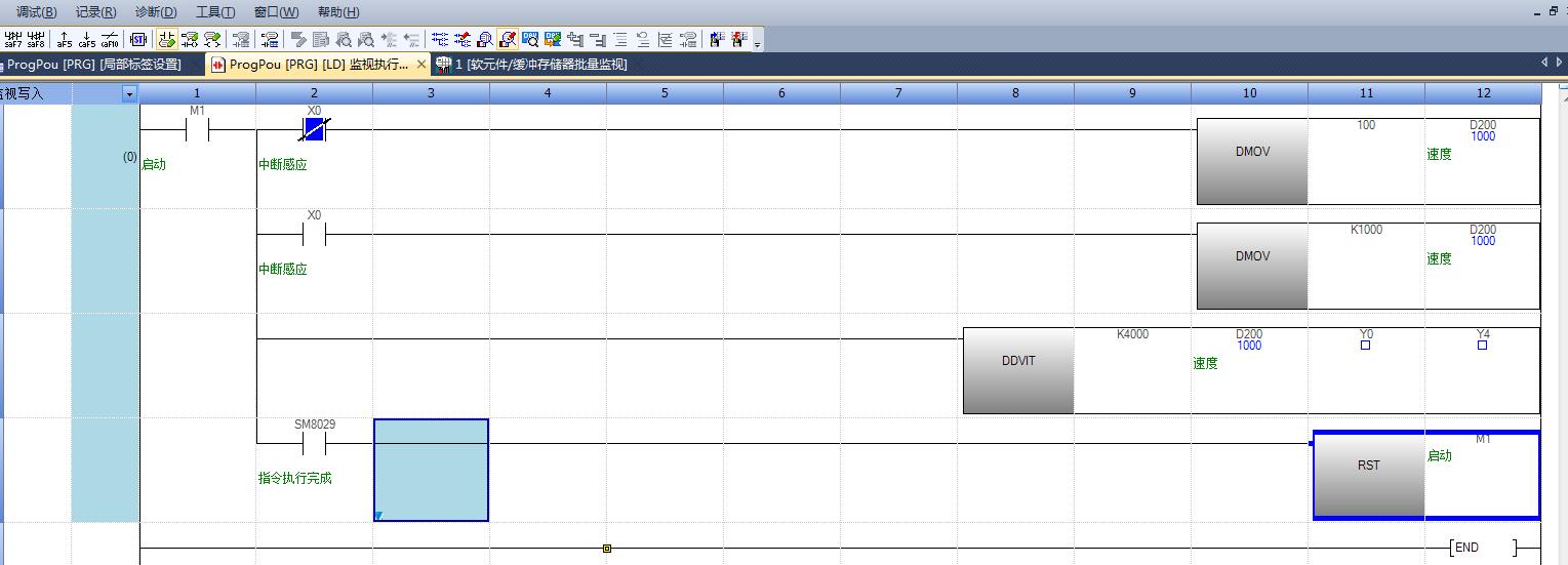 如圖所示,用中斷定位指令時(shí)候,可以根據(jù)是否有中斷感應(yīng),進(jìn)行區(qū)分兩段速度控制,但是沒有加這個,就不能隨便改變速度,否則立馬報(bào)警停止。
