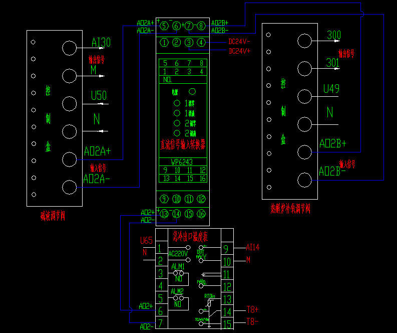入堿液調(diào)節(jié)閥,二路AO2B+,AO2B-入熱解爐補(bǔ)氧調(diào)節(jié)閥.堿液調(diào)節(jié)閥輸出AI30入PLC,顯示儀表輸出AI14入PLC,