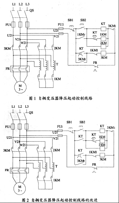 自耦變壓器降壓起動, 又稱為補(bǔ)償器降壓起動, 可用抽頭調(diào)節(jié)自耦變壓器的變比以改變起動電流和啟動轉(zhuǎn)矩大小。傳統(tǒng)自耦變壓器起動大多數(shù)是用加時間繼電器來控制。以下是根據(jù)某本中級電工培訓(xùn)指導(dǎo)書上自耦變壓器降壓起動控制線路所存在的弊病做了改進(jìn)。改進(jìn)后的控制線路投入使用以來, 運(yùn)行穩(wěn)定、可靠, 沒有出現(xiàn)故障。