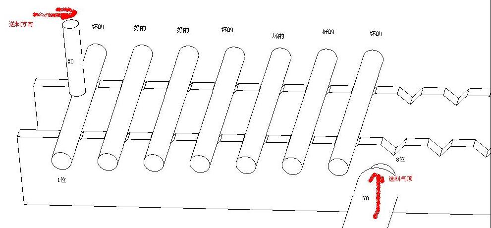 工件是跳動的向前送的,我要把壞的工件頂掉.程序如何寫,謝謝.