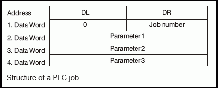 一個 PLC 作業(yè)包含 4 個數(shù)據字。第一個數(shù)據字包含作業(yè)號。根據所指定的作業(yè)號功能,最多可以在數(shù)據字 2 到 4 中傳入 3 個參數(shù)。下圖顯示了該數(shù)據結構。