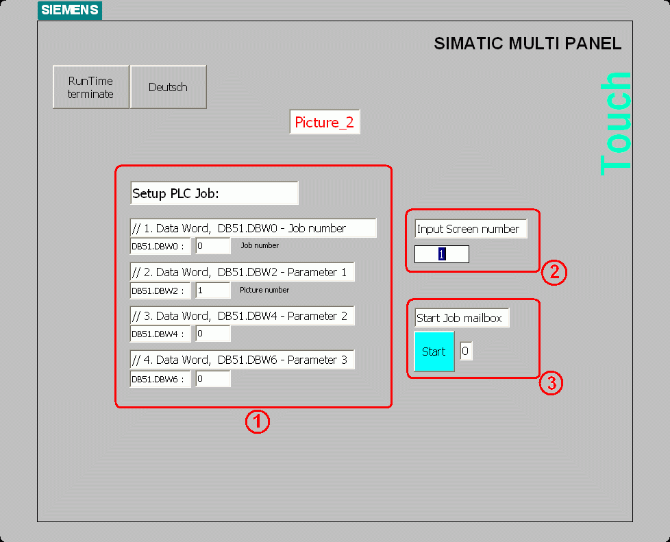 * 通過控制器將希望調用的畫面編號輸入作業(yè)信箱的第二個數(shù)據字( DB51.DBW2 )。如果需要,還可以在作業(yè)信箱的第四個數(shù)據字 ( DB51.DBW6 ) 中輸入畫面中相應的域號。